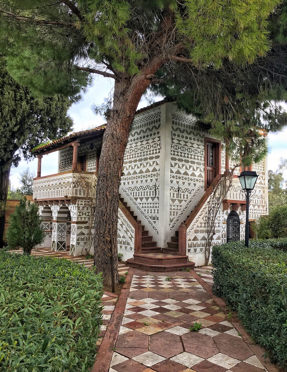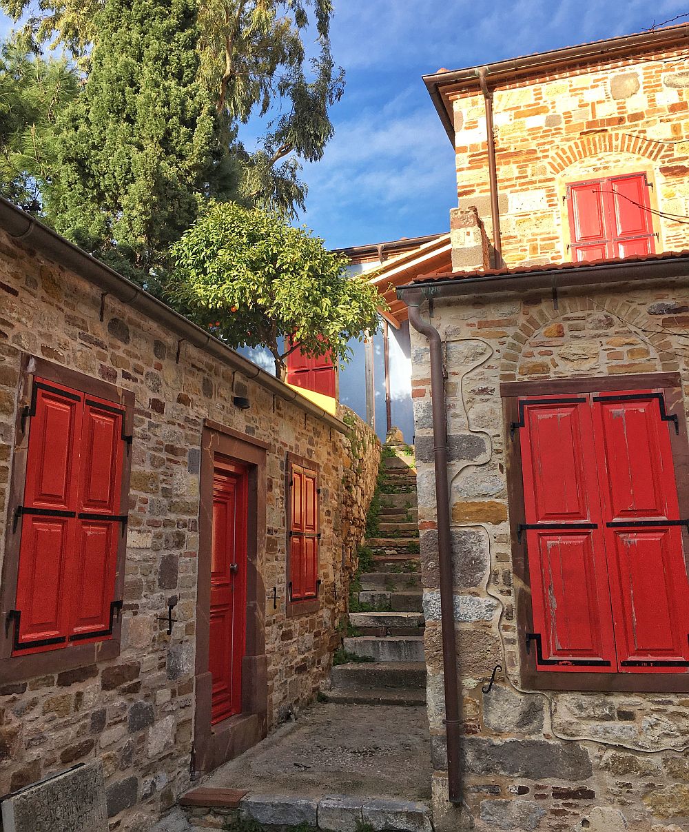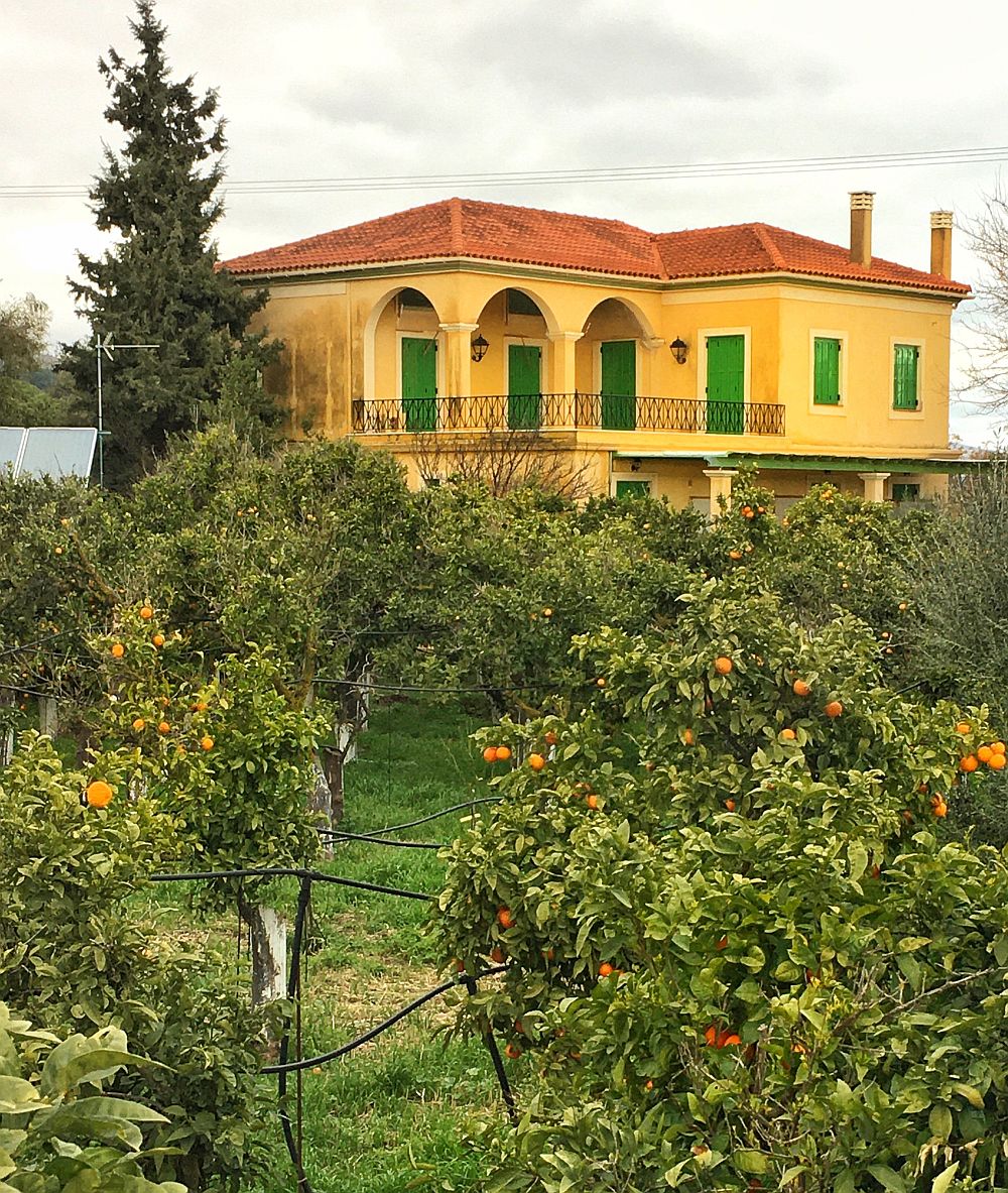 The natural environment is in total harmony with the local architecture, and the high walls, built of local reddish stone from the village of Thymiana, protect the mansions and citrus orchards from extreme weather conditions. Architectural features include arched doors and windows, balconies and terraces decorated with bas-reliefs, huge iron garden doors and marble-paved alleys.