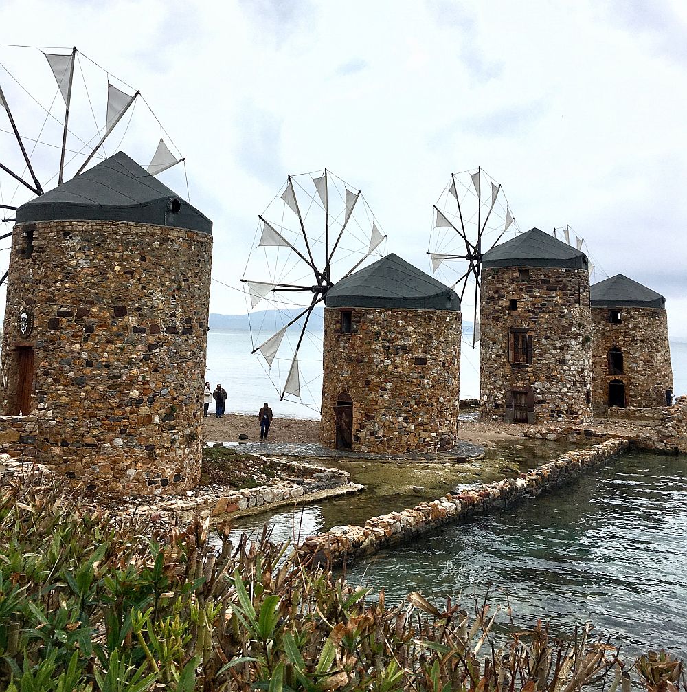 Cele patru mori de vânt tradiționale din Chios constituie unul dintre cele mai faimoase repere ale insulei, si sunt situate la 1,5 km nord de orașul Chios, în zona Tampakika. Asezate pe malul marii, construite din piatra la sfârșitul secolului al XIX-lea, acum complet restaurate, morile de vânt care au făcut cândva parte din trecutul industrial al insulei, ca mici ateliere de tăbăcire și prelucrare a pielii, sunt un loc foarte cinematografic pentru a admira apusul soarelui, gratie emoției și esteticii vizuale oferite.
